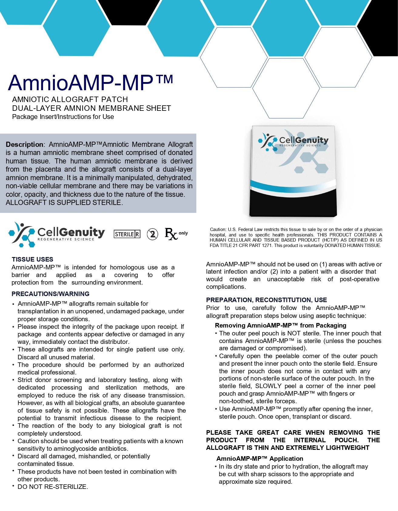 AmnioAMP-MP™ is a membrane allograft that may be used as a therapeutic active barrier agent in numerous clinical applications. The membrane forms a protective covering over the wound to preserve tissue structure and biologic integrity.  AmnioAMP-MP™ created with our proprietary PūrAMP Process™, offers mechanical protection and retains nutrient growth factors that are essential for signaling¹².  The product undergoes active preservation of the extracellular matrix (ECM), regulatory proteins, and removal of blood contaminants via a proprietary PūrAMP Process™.  AmnioAMP-MP™ is HCT/P compliant under section 361 of the Public Health Service Act according to 21 CFR Part 1271.10.  This is regulated as human cell product-for homologous use only.